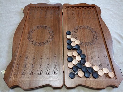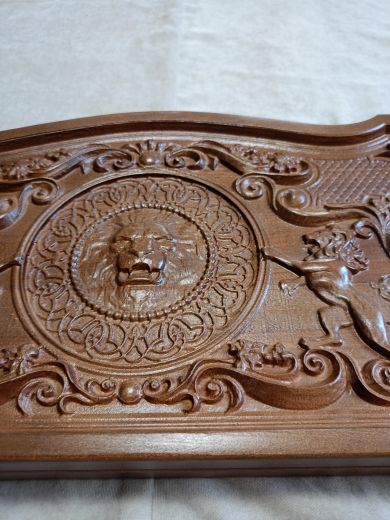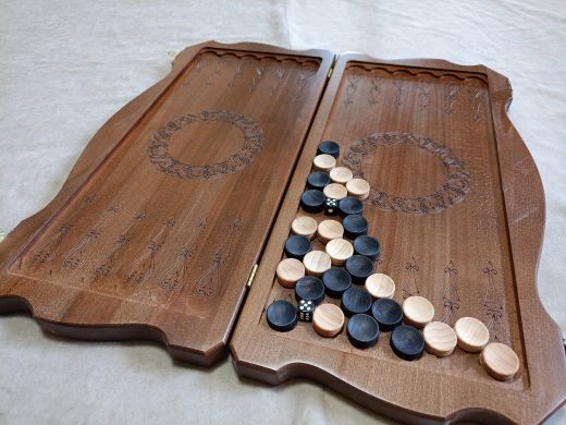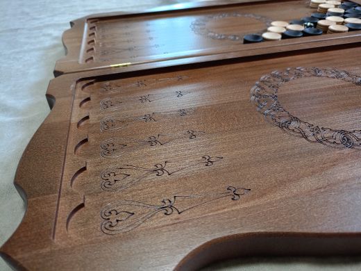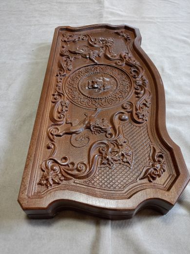 Нарды «Ивановские Лев» выделяются своей фигурной основой и резьбой. Эти нарды изготовлены из массива бука. Лицевая сторона украшена обильной резьбой. В комплект входят фишки и зары. Данная линейка нард создается по самой передовой технологии. Размер: 59*30 см в сложенном виде.
