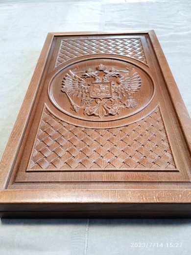 Нарды «Россия» изготовлены из патинированного бука. Лицевая сторона украшена резьбой с изображением древнейшего русского герба, ныне герба Российской Федерации. Доска соответствует всем требованиям профессионалов и любителей игры в нарды: деревянные фишки диаметром 29 мм имеют комфортные для захвата углубления по центру, удобные ячейки (лузы), ложемент для хранения фишек и костей по краю игрового полотна. В комплект входят фишки и зары.