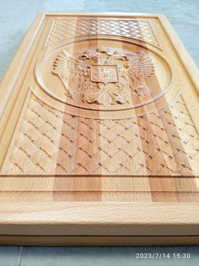 Нарды «Россия» посвящены всем патриотам своей Родины. Эти нарды изготовлены из массива бука. Лицевая сторона  украшена резьбой с изображением древнейшего русского герба, ныне герба Российской Федерации, а внутренняя и обратная стороны нард отделаны натуральным шпоном (из экзотических пород африканских деревьев) в технике маркетри. На оборотной стороне нард расположено поле для игры в шашки. Доска соответствует всем требованиям профессионалов и любителей игры в нарды: деревянные фишки диаметром 29 мм имеют комфортные для захвата углубления по центру, удобные ячейки (лузы), ложемент для хранения фишек и костей по краю игрового полотна. В комплект входят фишки и зары.