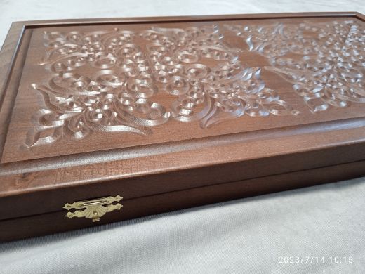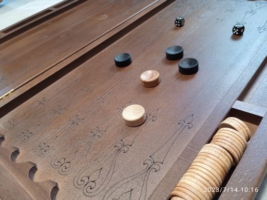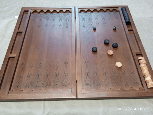 Нарды WGN45 изготовлены из массива бука. В них раскрывается вся фактура и красота дерева. Внешнюю сторону украшает резной фрагмент. Для удобства игроков на поле нард расположены лучи, выделенные тонировкой. Доска соответствует всем требованиям Федерации спортивных нард и бэкгамон: деревянные фишки имеют комфортные для захвата углубления по центру, возможно расположить все фишки вдоль края поля, что важно при игре в длинные нарды, удобные ячейки (лузы), ложемент для хранения фишек и костей по краю игрового полотна.
