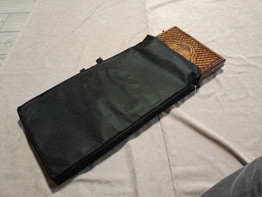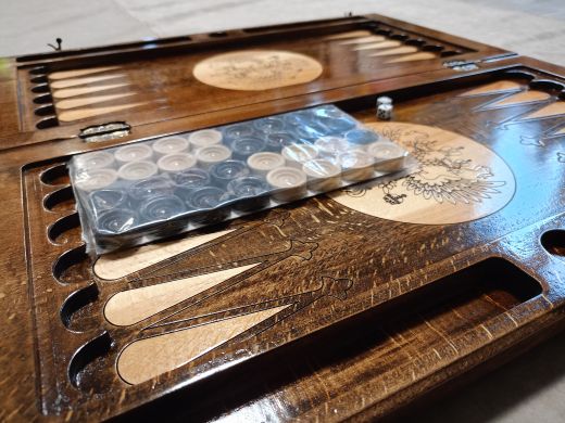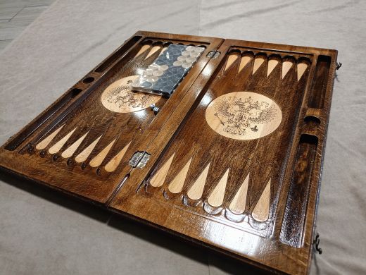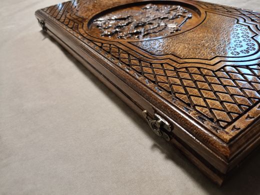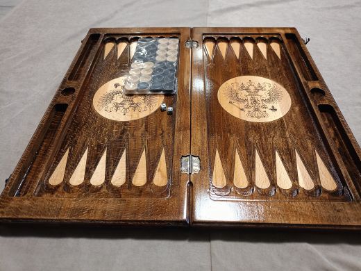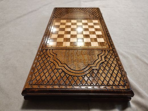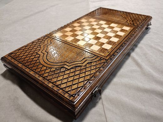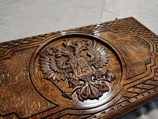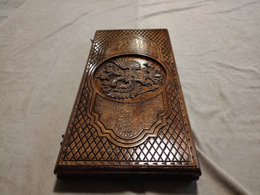 Резные нарды "Держава", ручной работы, из массива бука; Покрытие: глянцевый/матовый лак; Размер в закрытом виде: 60х30х6 см.; Кости: 2 штуки; Фишек светлых: 16 шт.; Фишек темных: 16 шт.; Страна-производитель: Армения ; Чехол; Вес нард: 5 кг.