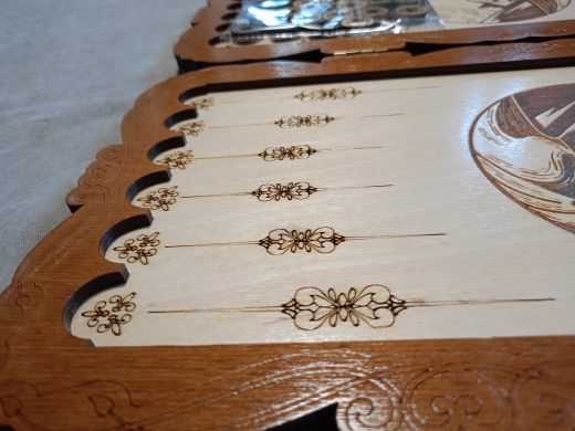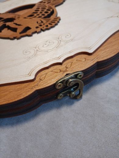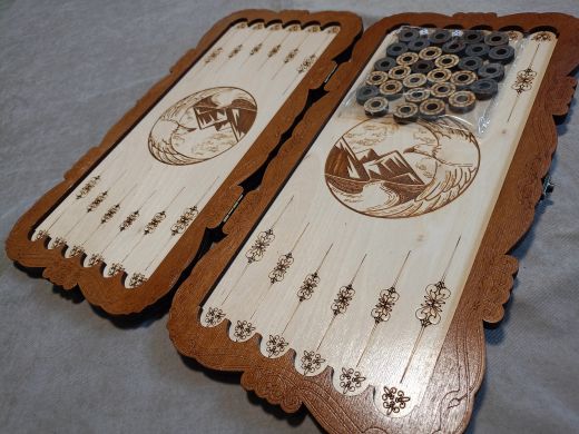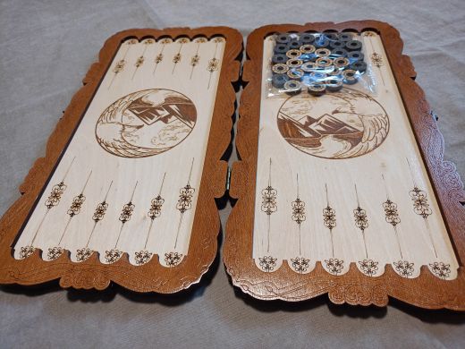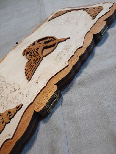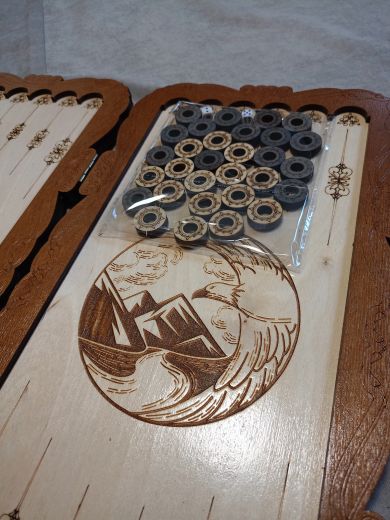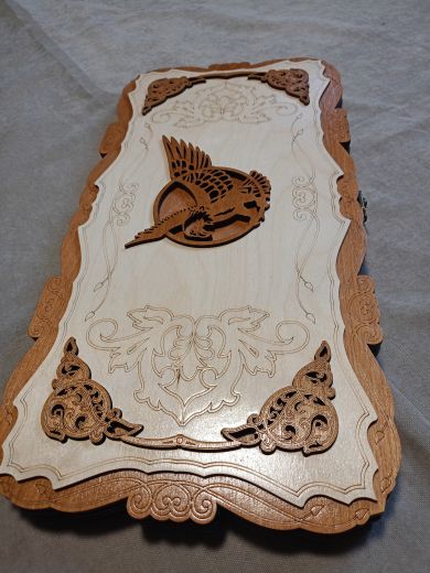 Нарды средние резные "Орёл", ручной сборки. Деревянные нарды выполнены из березы высочайшего качества и покрыты износостойким лаком в три слоя! Это обеспечивает прочность и устойчивость к негативному влиянию внешней среды, соответственно, и продолжительный срок эксплуатации. В комплекте с резными нардами идут КУБИКИ и ФИШКИ (30шт), имеющие ОТВЕРСТИЕ, благодаря которому их удобно перемещать, а БАРХАТНОЕ покрытие, обеспечивает идеальное скольжение по площади игровой зоны. Нарды имеют прочную защелку с курковым механизмом - случайное открытие исключено! Размер нард: 48*24*4 см