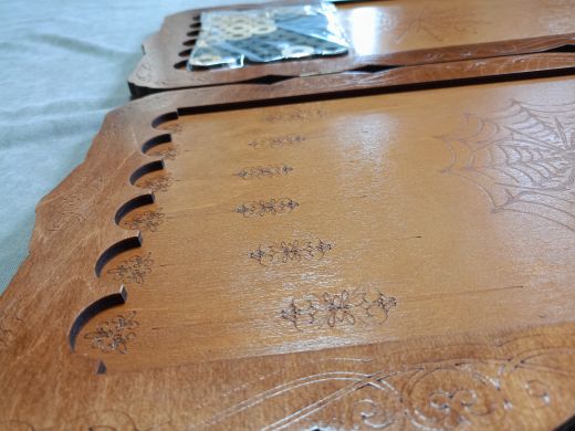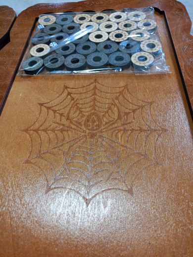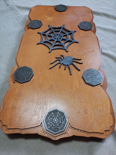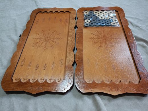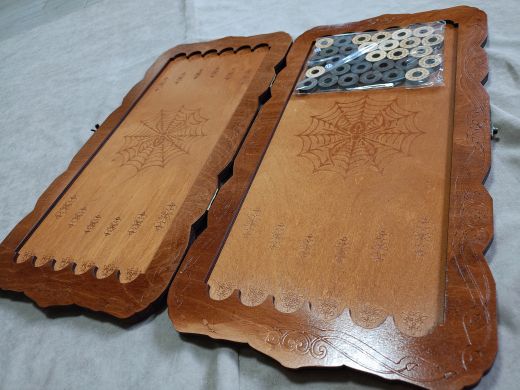 Нарды большие резные "Паук", ручной сборки. Деревянные нарды выполнены из березы высочайшего качества и покрыты износостойким лаком в три слоя! Это обеспечивает прочность и устойчивость к негативному влиянию внешней среды, соответственно, и продолжительный срок эксплуатации. В комплекте с резными нардами идут КУБИКИ и ФИШКИ (30шт), имеющие ОТВЕРСТИЕ, благодаря которому их удобно перемещать, а БАРХАТНОЕ покрытие, обеспечивает идеальное скольжение по площади игровой зоны. Нарды имеют прочную защелку с курковым механизмом - случайное открытие исключено! Размер нард: 57*29*4 см