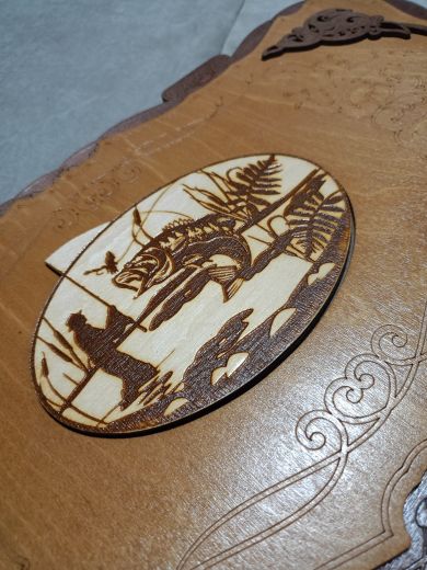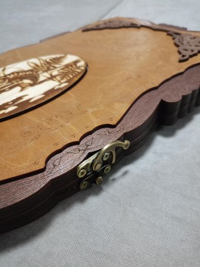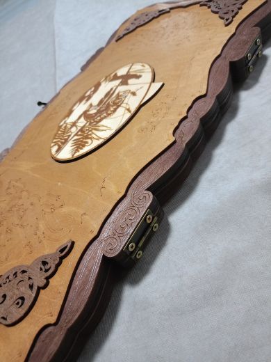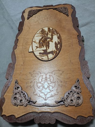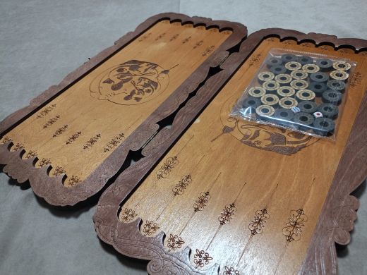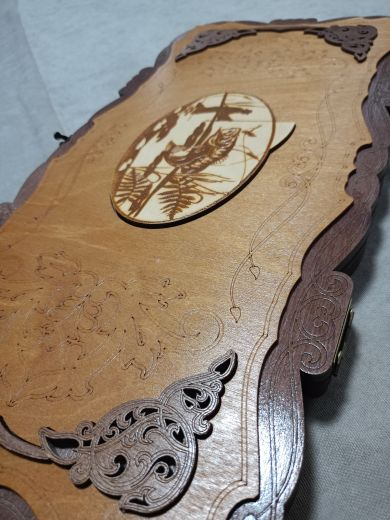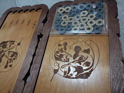 Нарды средние резные "Рыбак", ручной сборки. Деревянные нарды выполнены из березы высочайшего качества и покрыты износостойким лаком в три слоя! Это обеспечивает прочность и устойчивость к негативному влиянию внешней среды, соответственно, и продолжительный срок эксплуатации. В комплекте с резными нардами идут КУБИКИ и ФИШКИ (30шт), имеющие ОТВЕРСТИЕ, благодаря которому их удобно перемещать, а БАРХАТНОЕ покрытие, обеспечивает идеальное скольжение по площади игровой зоны. Нарды имеют прочную защелку с курковым механизмом - случайное открытие исключено! Размер нард: 48*24*4 см