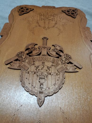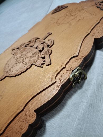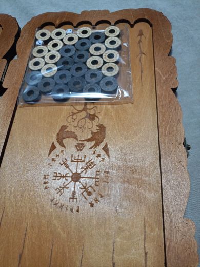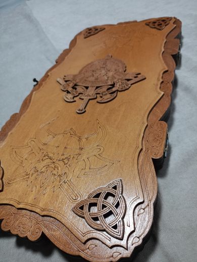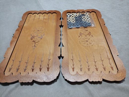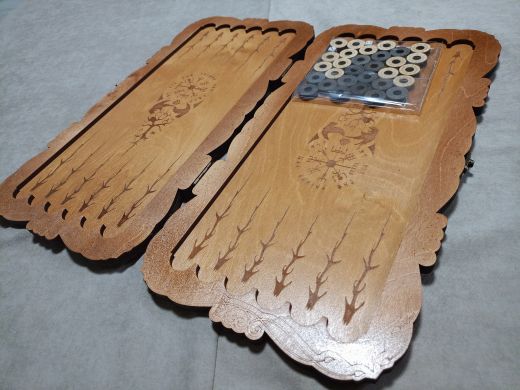 Нарды средние резные "Викинг", ручной сборки. Деревянные нарды выполнены из березы высочайшего качества и покрыты износостойким лаком в три слоя! Это обеспечивает прочность и устойчивость к негативному влиянию внешней среды, соответственно, и продолжительный срок эксплуатации. В комплекте с резными нардами идут КУБИКИ и ФИШКИ (30шт), имеющие ОТВЕРСТИЕ, благодаря которому их удобно перемещать, а БАРХАТНОЕ покрытие, обеспечивает идеальное скольжение по площади игровой зоны. Нарды имеют прочную защелку с курковым механизмом - случайное открытие исключено! Размер нард: 48*24*4 см