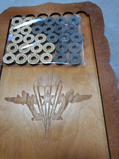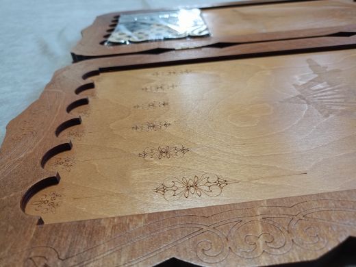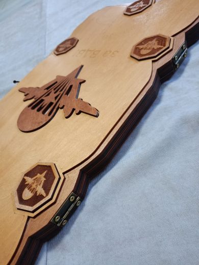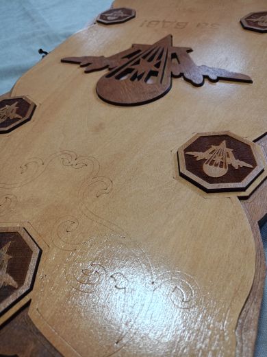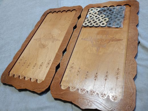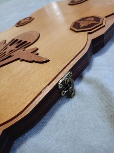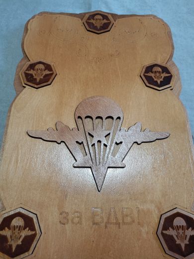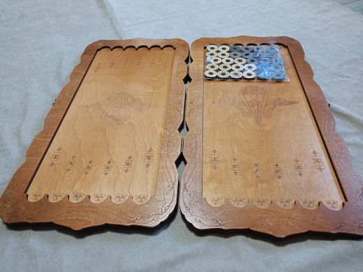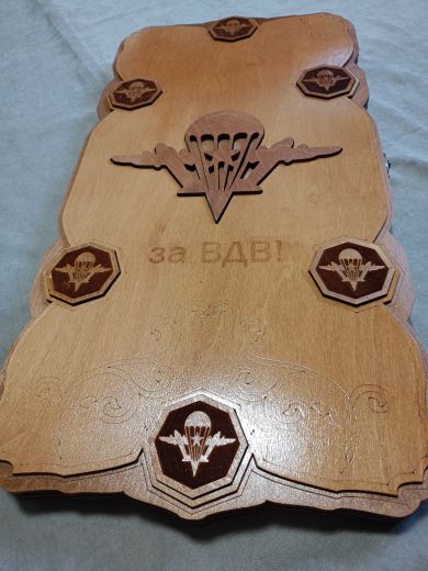Нарды большие резные "За ВДВ", ручной сборки. Деревянные нарды выполнены из березы высочайшего качества и покрыты износостойким лаком в три слоя! Это обеспечивает прочность и устойчивость к негативному влиянию внешней среды, соответственно, и продолжительный срок эксплуатации. В комплекте с резными нардами идут КУБИКИ и ФИШКИ (30шт), имеющие ОТВЕРСТИЕ, благодаря которому их удобно перемещать, а БАРХАТНОЕ покрытие, обеспечивает идеальное скольжение по площади игровой зоны. Нарды имеют прочную защелку с курковым механизмом - случайное открытие исключено! Размер нард: 57*29*4 см