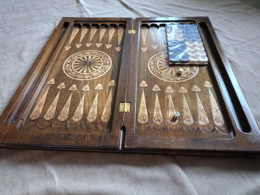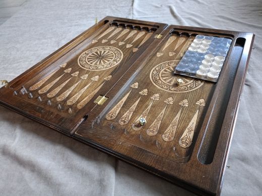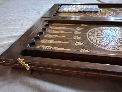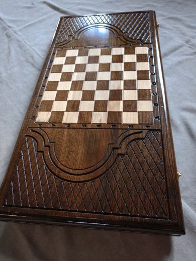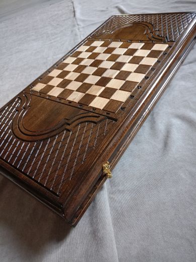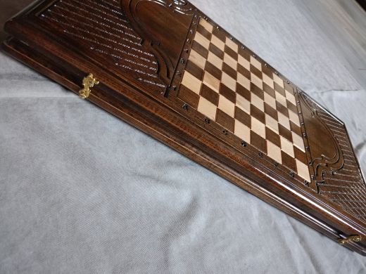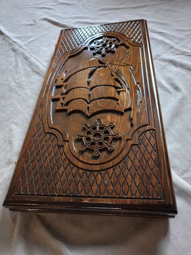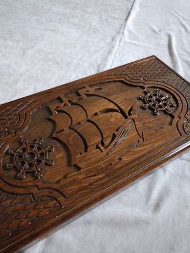 Резные нарды "Парусник", ручной работы, из массива бука; Покрытие: глянцевый/матовый лак; Размер в закрытом виде: 60х30х6 см.; Кости: 2 штуки; Фишек светлых: 16 шт.; Фишек темных: 16 шт.; Страна-производитель:Армения ; Чехол; Вес нард: 4,5 кг.