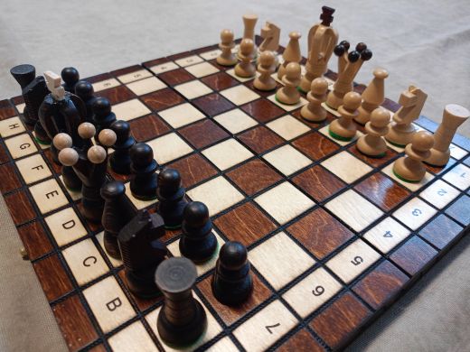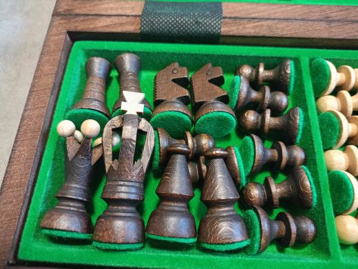 "Королевские" (30 см) — компактный набор подарочных деревянных шахмат. Резные фигуры сделаны из цельной древесины. Покрыты матовым лаком. Основание фигур покрыто войлоком зелёного цвета.Доска складная, деревянная, вручную украшена выжиганиями. Внутри доски два раздельных отсека для хранения чёрных и белых фигур. Сбоку доски железный замочек, который предотвращает произвольное раскрытие. Со всех сторон от игрового поля, на доску вручную нанесена шахматная нотация методом декоративного выжигания. Размер в разложенном виде — 30x30 см., в сложенном — 30x15 см. Высота короля — 7 см., высота пешки — 3 см.